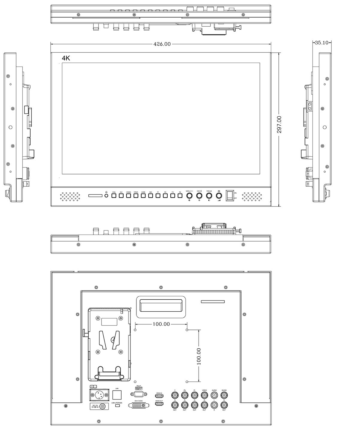 Multiple input formats meet the needs of the professional input and display functions with all HD, SD, analogue video signal inputs. The monitor comes with 3G HD-SDI, HDMI, Composite, and Component input and ouput.