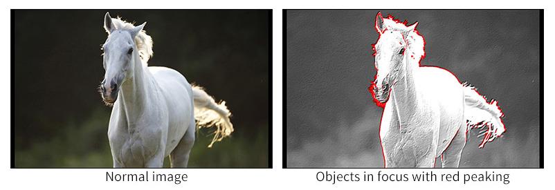 * Peaking Focus Assist(Red highlight over parts of the monochrome image in focus)