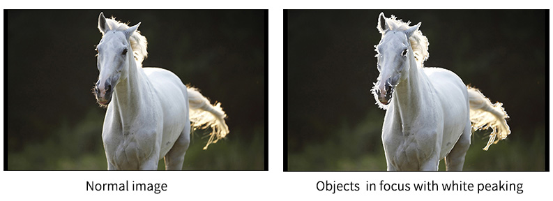 The Peaking Filter is used to aid the camera operator in obtaining the sharpest possible picture. When activated, the internal processor will display a colored highlight on the screen where sharp edges appear. It's shows white highlight over parts of the image in focus.